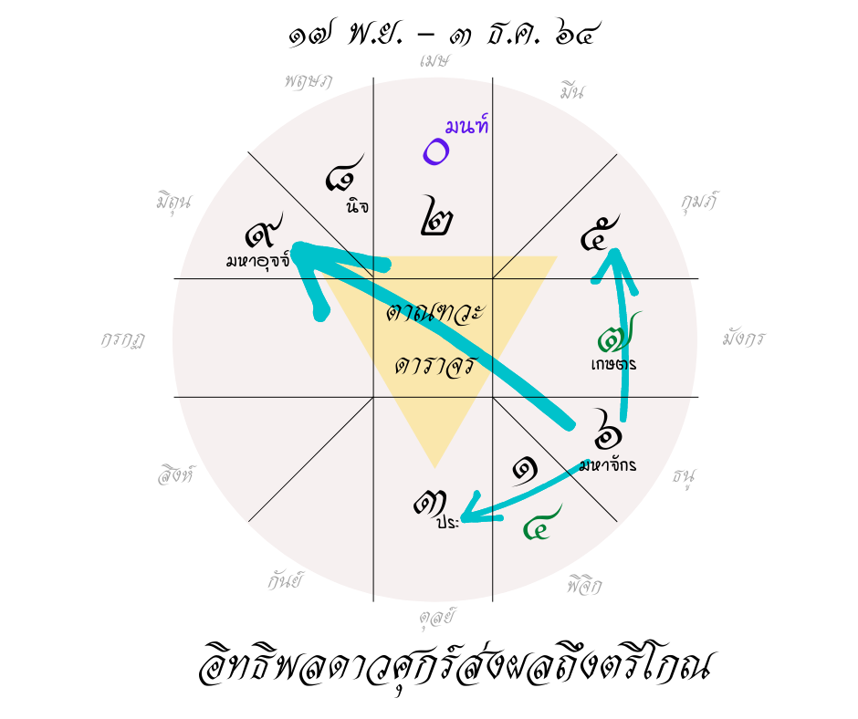 เมื่อพิจารณาดาวศุกร์ จะเห็นได้ว่ามีดาวศุกร์จรที่ราศีธนู ได้ทำเนียบมหาจักร ซึ่งโยคถึง 3 ราศีที่ทำมุมเป็นตรีโกณธาตุลม เกิดเป็นกลุ่มดาว ๓๕๖๙ และเมื่อสังเกตว่า ดาวศุกร์ได้รับอิทธิพลจากดาวราหูที่จรอยู่ในราศีพฤษภ และดาวอังคารได้รับอิทธิพลจากดาวมฤตยูจรที่อยู่ในราศีเมษ ก็จะส่งผลที่ดีกับดาวคู่มิตร “ศุกร์ปากหวานอังคารรับเอา” ทำนายว่าจะเกิดความไว้วางใจ เป็นที่รัก ได้เป็นหัวหน้าหรือผู้นำ ได้เป็น Hero เป็น Idol มีเหตุการณ์อันน่ารักใคร่ หรือ ถือเอาเป็นเยี่ยงอย่างที่ดี ส่งผลต่อคนราศีธนู และราศีตุลย์