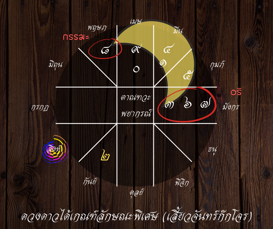 - เมื่อพิจารณาหัวและท้ายของเสี้ยวจันทร์จะเห็นดวงดาวจรปรากฏเป็น ๓๖๗๘ ครบก๊กโจร นั่นย่อมหมายถึงจะเกิดเหตุการณ์โจรๆ การปล้น การฉ้อฉล-กลโกง สิ่งที่ทำเพื่อหวังผลชั่วข้ามคืน ทำเพื่อความสะใจ เรื่องสีเทาๆ ต่างๆ