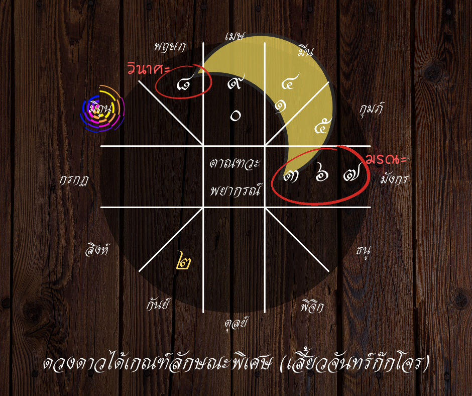- สำหรับคนราศีมิถุน หัวท้ายอยู่ที่ช่อง [มรณะ – วินาศะ] จะมีเหตุโจรๆ เกิดขึ้นไกลตัว ไม่ส่งผลถึง เพราะลัคนาอยู่นอกเสี้ยวจันทร์เป็นเรื่องไกลตัวเกี่ยวกับความเสื่อมโทรมและความพินาศเสียหาย