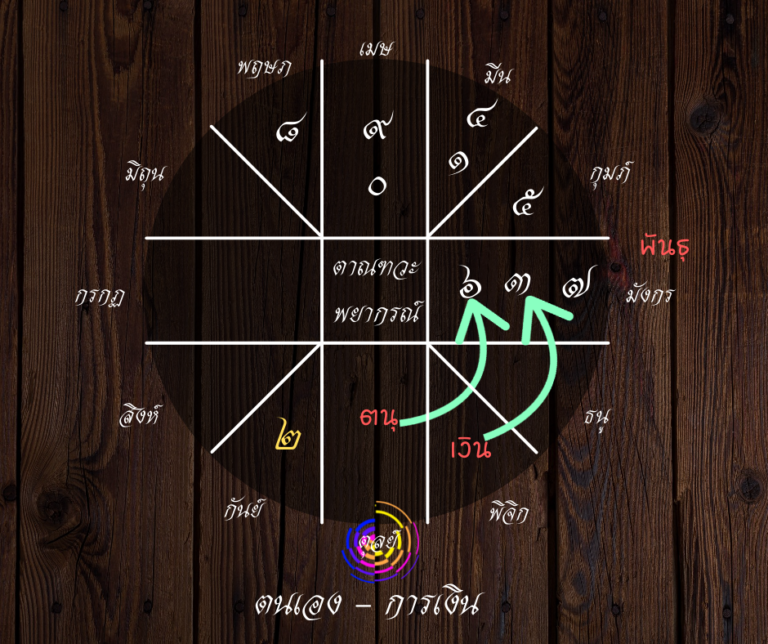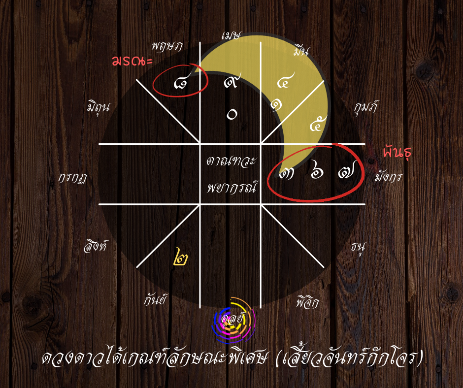 - สำหรับคนราศีตุลย์ หัวท้ายอยู่ที่ช่อง [พันธุ – มรณะ] จะมีเหตุโจรๆ เกิดขึ้นกับเรื่อง “บ้านที่เสื่อมโทรม-อยู่ไกล” หรือ “สุขภาพของญาติๆ” (แต่ไม่เกิดขึ้นกับคนราศีตุลย์โดยตรง เพราะลัคนาอยู่นอกเสี้ยวจันทร์)
