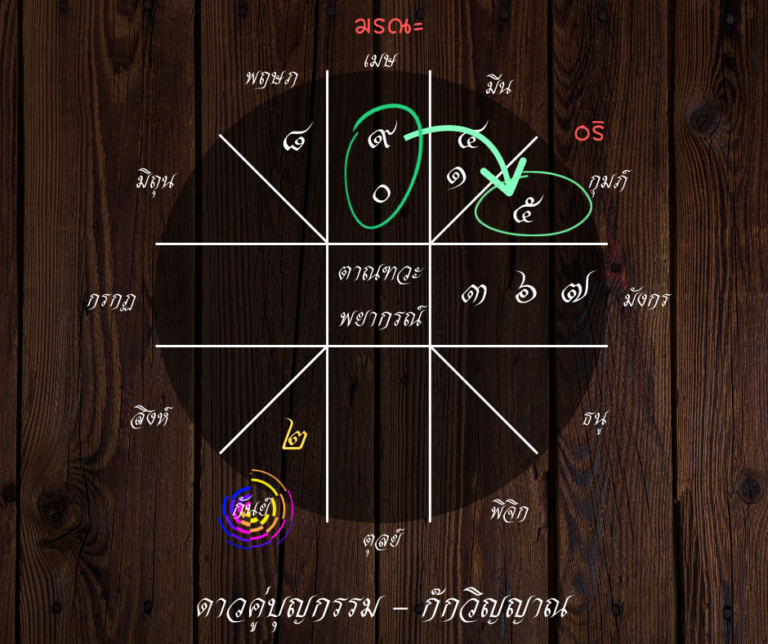 - สำหรับคนราศีกันย์ หัวท้ายอยู่ที่ช่อง [ศุภะ – ปุตระ] จะมีเหตุโจรๆ เกี่ยวข้องกับเรื่อง ผู้หลักผู้ใหญ่กับบุตรบริวาร คือคนที่ใหญ่กว่าและคนที่เล็กกว่าเรา (แต่ไม่เกิดกับคนราศีกันย์โดยตรง เพราะลัคนาอยู่นอกเสี้ยวจันทร์)