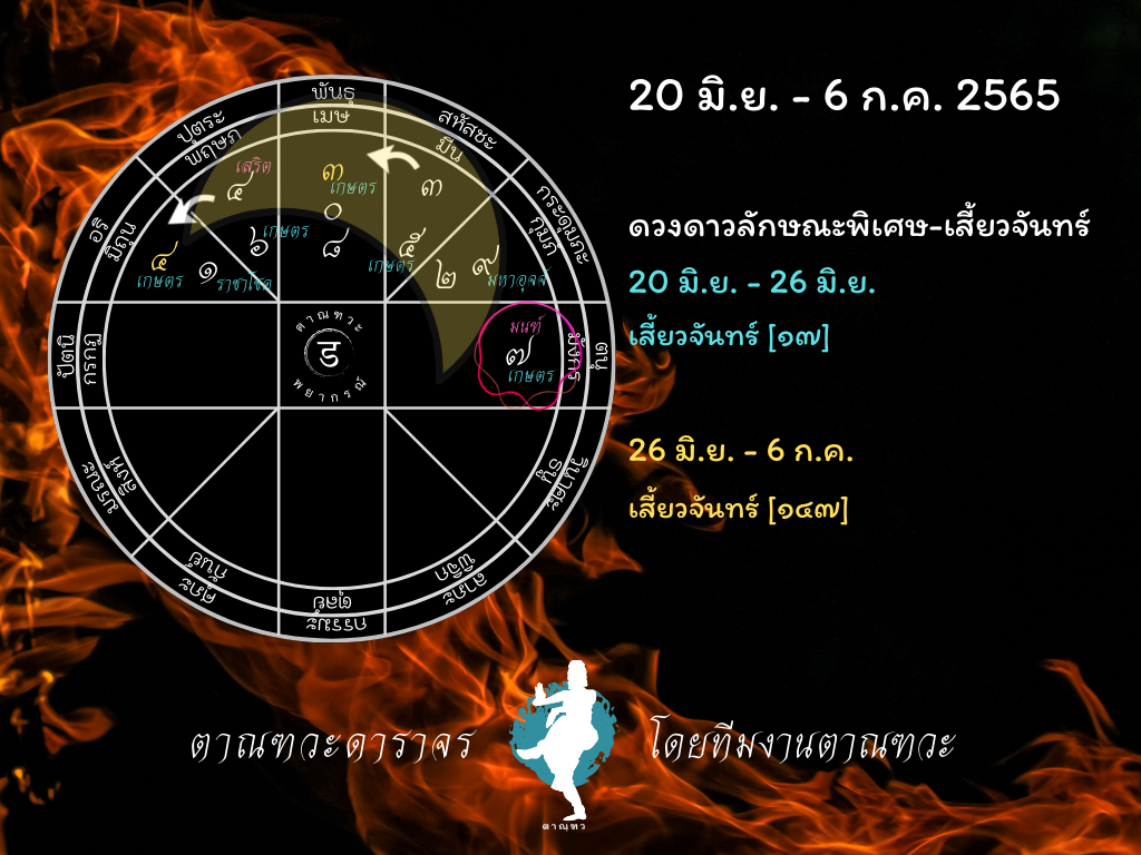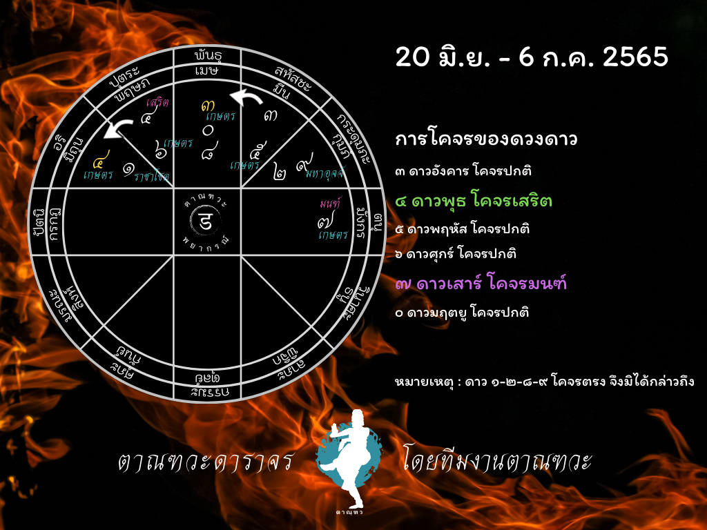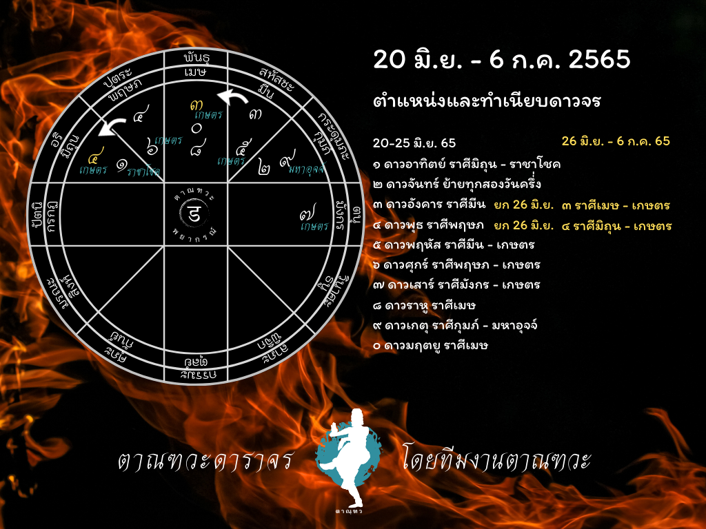 สวัสดีค่ะ วันนี้พบกับตาณฑวะดาราจร การพยากรณ์ดาวจร ด้วยหลักวิชาโหราศาสตร์ไทย ในช่วงวันที่ 20 มิถุนายน ถึง 6 กรกฎาคม 2565 เราจะดูกันว่า ดาวจรในช่วงนี้จะส่งผลดีร้ายอย่างไร ทั้งในภาพรวม และ ผลกระทบสำรับคนทุกราศีเกิด เชิญอ่านบทความและรับชมคลิปกันได้เลยค่ะ